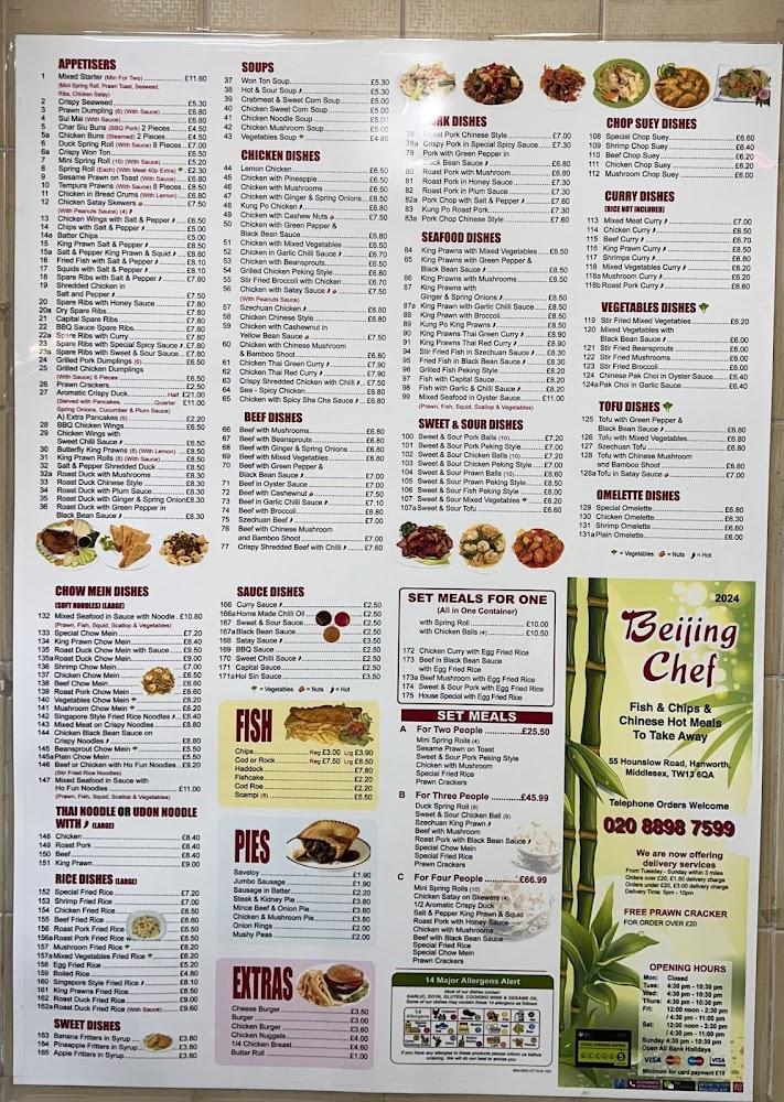 Situated at 55 Hounslow Rd, Feltham, TW13 6QA, Beijing Chef Ltd excels in offering both Chinese cuisine and British classics like fish and chips. With a phone number for reservations at +44 20 8898 7599, diners can easily connect to ensure they snag a spot. The restaurant is accessible, featuring wheelchair-friendly entrances, seating, and restrooms. This dedication to inclusivity makes it an ideal choice for family gatherings and celebrations. Operating throughout the week, Beijing Chef Ltd provides a casual atmosphere, perfect for any day whether you’re stopping in for a quick meal or looking to savor a delightful dinner. Additionally, various payment options like credit cards and NFC mobile payments make transactions smooth. Popular dinner hours see a bustling crowd, emphasizing the restaurant’s reputation within the community.